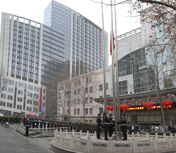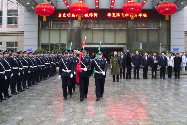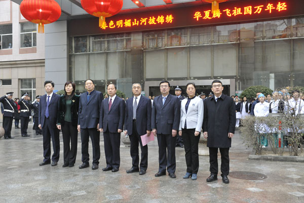 医院全体党政领导向大家拜年送祝福,其后,在前庭广场举行了升国旗、院旗仪式。