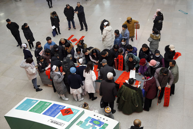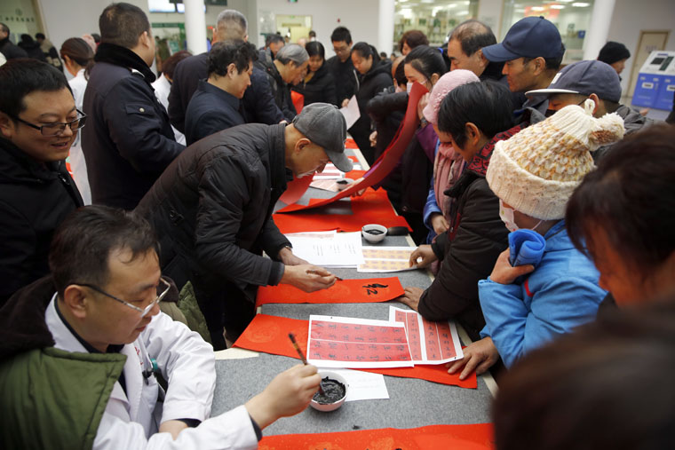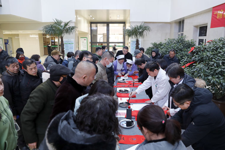 两个院区的活动开始后不久便吸引了大量来院患者及家属的目光,书法创作者们被层层围住,好不热闹。“现在可以免费领春联,快来”,一位大爷赶忙把这一消息告诉老伴儿。书画协会的学员们提前打印好春联集供每一位朋友选择,大多家属选择了象征平安、健康、幸福的语句,表达了对新年的期望和祝愿。