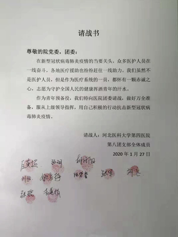 面对来势汹汹的疫情,作为医院的年轻力量,广大团员青年牢树大局意识,服从组织安排,积极踊跃请战。临床一线的青年医护工作者发出了“服从安排,随时出征,不计报酬,无论生死”的铮铮誓言;后勤行政的青年同志们表示,“作为医疗系统的一员,作为青年预备役,已做好万全准备,到最需要的地方去”。一份份情真意切的请战书,一枚枚鲜红的手指印,彰显了果冻传媒