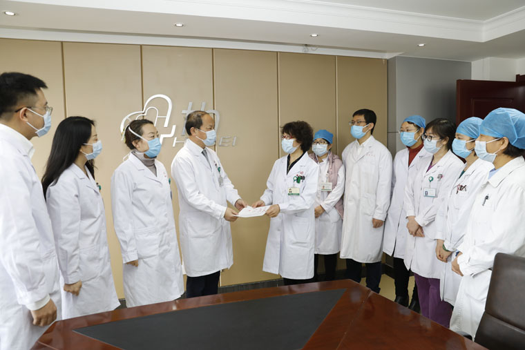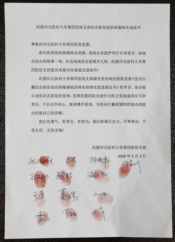 放三科主任祝淑钗和民盟四院支部主委陈彦平的带领下,盟员代表将按有13位盟员鲜红手印的请战书交到了单保恩书记的手中,并郑重表态:“坚决服从党组织及医院的安排,发挥民盟四院支部作为民主党派成员应尽的责任,不忘合作初心,继续携手前进,我们有勇气,有责任,必将竭尽全力,不辱使命,不畏生死,无怨无悔!”单保恩书记表示,“民盟四院支部有着优秀的传统,平日立足本职工作,努力服务社会,在自己的岗位上兢兢业业,出色完成了各项医教研工作,这次主动递交请战书,更体现了极高的政治觉悟和担当,让我们共克时艰,为坚决打赢疫情防控狙击战作出应有的贡献。”