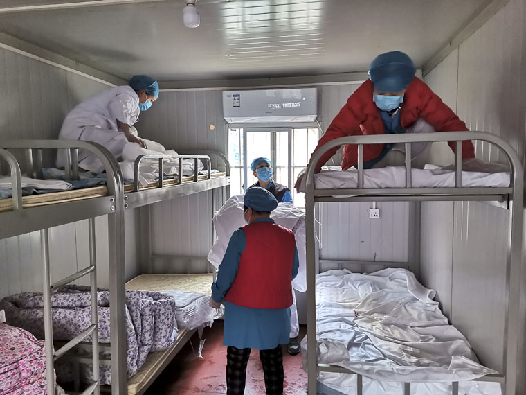 被服站工作人员为发热门诊生活区铺设床品