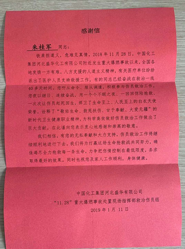 每当省内有重大抢救时,现场也总是少不了他的身影。2016年,河北省重症H7N9患者死亡率居高不下,省卫健委抽调他先后奔赴衡水、承德和保定指导并参与H7N9甲流病人的救治,挽救了大量重症患者的生命。2017年,张家口“7.21”重大车祸发生,他亲临现场,指导并参与了重症伤员抢救。2018年张家口“11.28”重大爆炸事故发生后,在省卫健委的安排调度下,朱桂军同志第一时间加入救治伤员团队,深入一线进行了为期长达30天的救治工作,为及时有效抢救伤员发挥了重要作用,救治伤员组临时党委对朱桂军同志做出了如下评价:靠得住、冲得上、打得赢,不负重托、不辱使命。