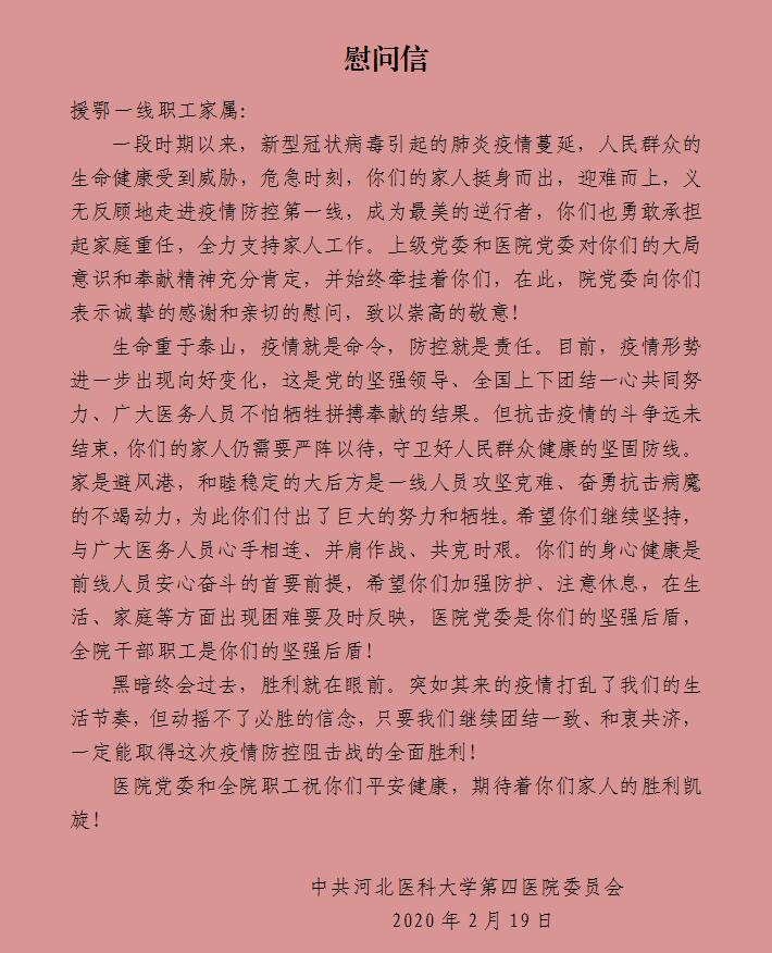 同日,单保恩书记、徐金升院长和李晓玲副书记代表医院党委,慰问了援鄂一线职工的家属,向他们送上了慰问信和慰问金。单书记说,你们的家人在援鄂一线表现突出,得到了各方的一致肯定,这与你们的无私奉献是分不开的。你们也是果冻传媒