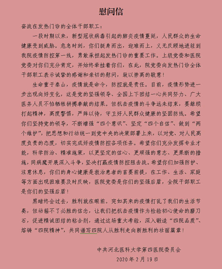 发热门诊全体职工对医院党委一直以来无微不至的关心和帮助表示衷心感谢。