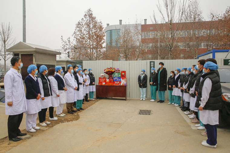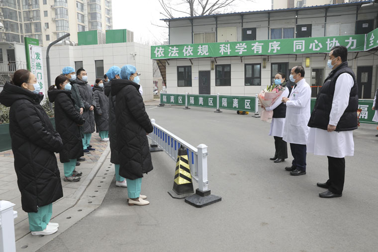 第二批医护人员接力进驻发热门诊。院领导带领相关职能部门负责人分别到本部和东院发热门诊看望了第二批“逆行者”。