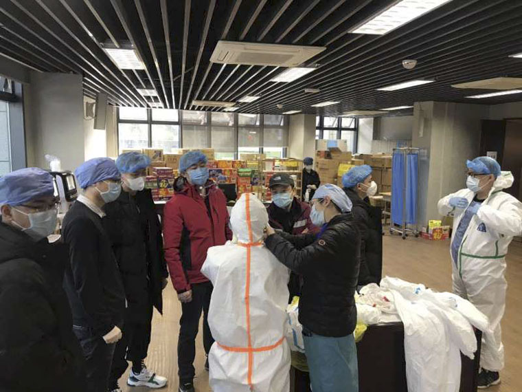 刘辉协助队友穿防护服,并做最后检查