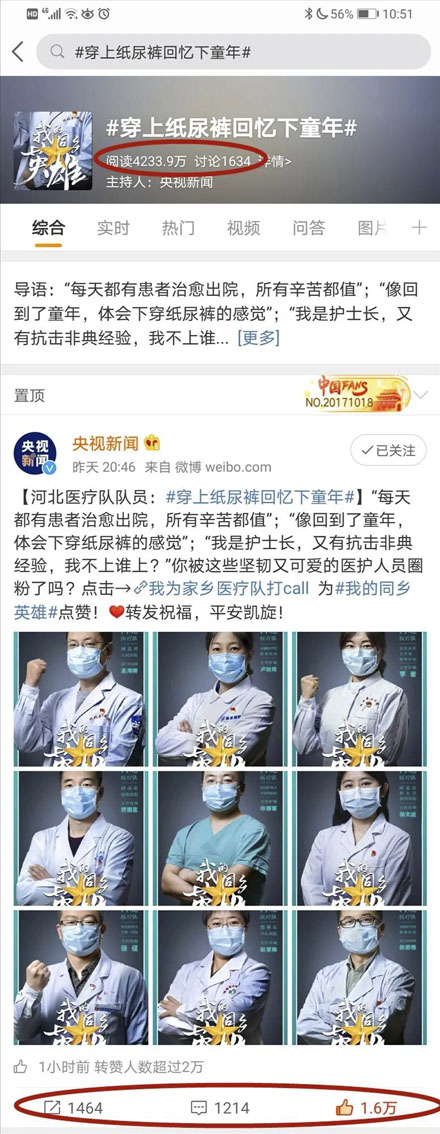重症医学科副护士长申康康接受采访时说的“挺好的,像回到了童年,还可以体会一下穿纸尿裤的感觉”形成微博超话:#穿上纸尿裤回忆下童年#,瞬间引起强烈反响。