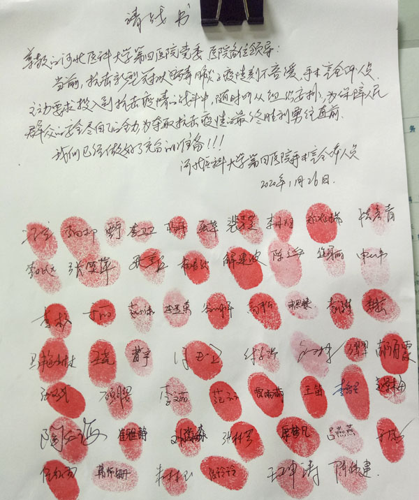 疫情就是命令,防控就是责任。在接到省卫健委和医院党委的通知后,手术室全体成员放弃休假,随时准备奔赴前线。在护士长冯立带领下,全员递交请战书,纷纷要求到一线去战斗。“我自愿报名,申请加入医院各项治疗新型冠状病毒肺炎的转运工作”,“不计报酬,不论生死,请让我上前线”……