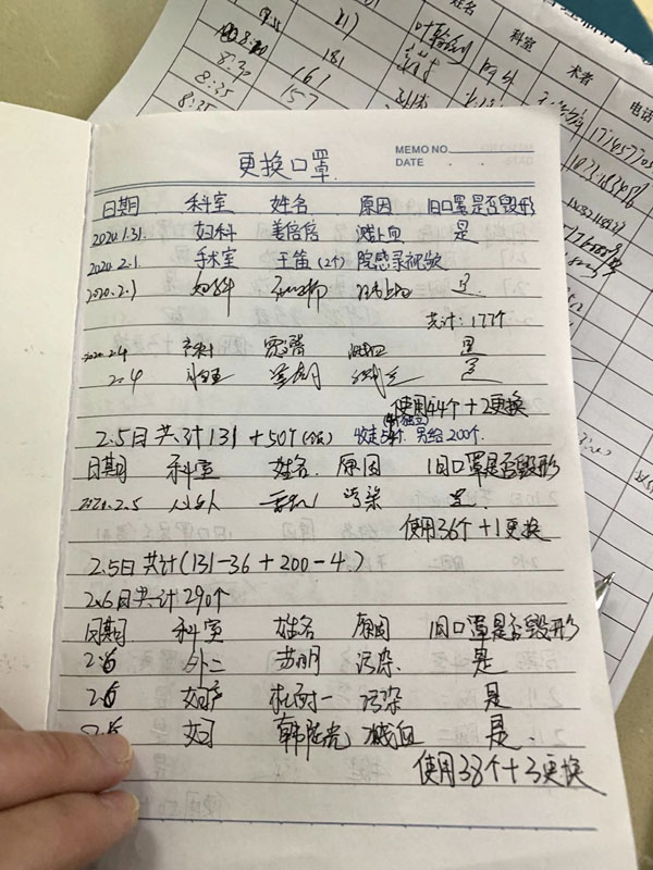 在防控物资紧缺的情况下,护士长带领院感组,由专人负责医疗物资管理,每日登记发放情况并汇总上报护士长,合理调配人员和医疗资源,确保战备物资合理、高效利用。