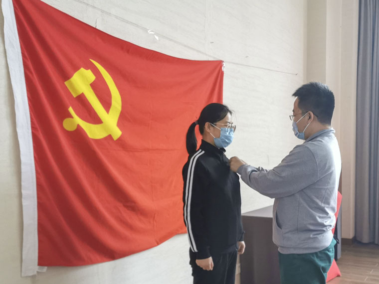 援鄂抗疫医疗队临时党支部书记申康康同志为王亚美同志佩戴党徽