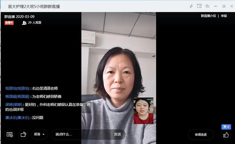 为了实现学生的“云端实习”,护理教学办公室和临床科室的老师们提前一周积极策划网络授课方式,建立了实习微信群,搭建实习科室、带教老师与学生们联系的桥梁,并按照实习安排开展网络授课。各科室的带教老师在保障临床和疫情防控工作的同时,利用微信群、QQ群和其他教学平台,通过直播、录播等形式,完成授课、教学查房等教学任务。通过直播示教、录制视频等形式,让学生熟悉本科室特色的护理操作。为了确保教学质量,带教老师们还督促学生书写相应的学习笔记上传,通过线上答题等形式完成出科考试。