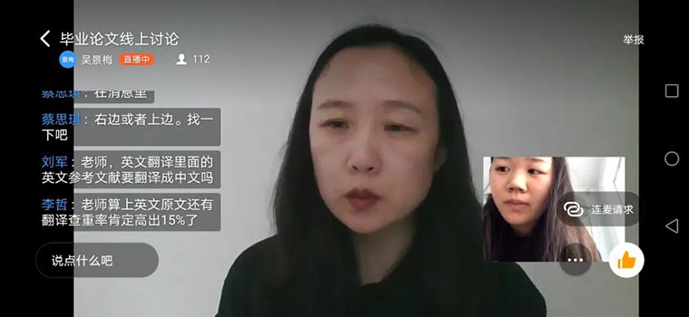 对于学生目前最关注的毕业论文事项,吴景梅老师分别于3月9日和16日两次通过“线上面对面”的形式,对学生在论文写作过程中出现的问题进行了集中答疑。同学们针对论文的结构要求、写作细节等方面展开提问,得到了悉心的指导。