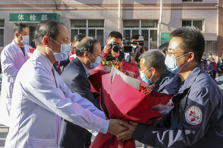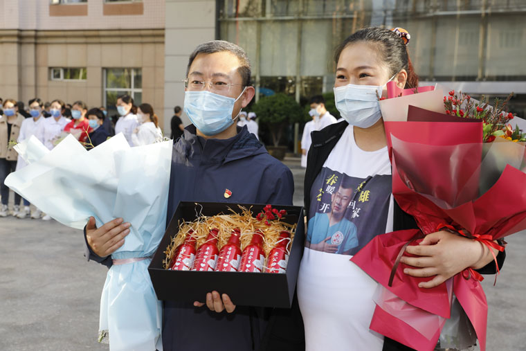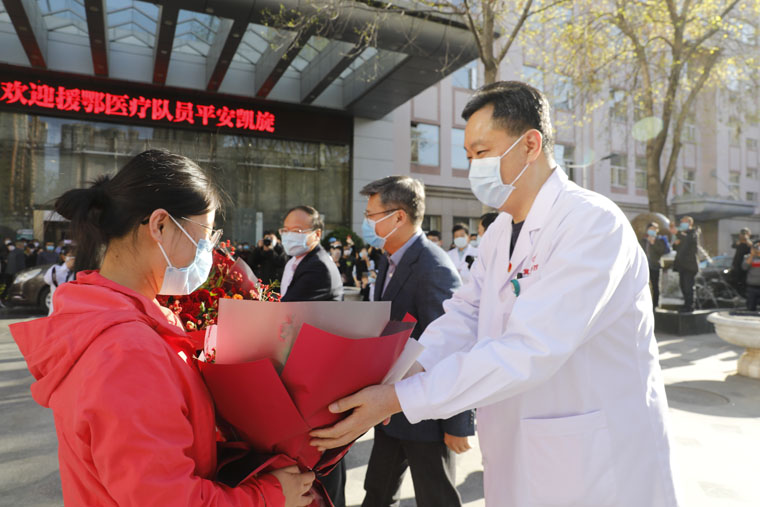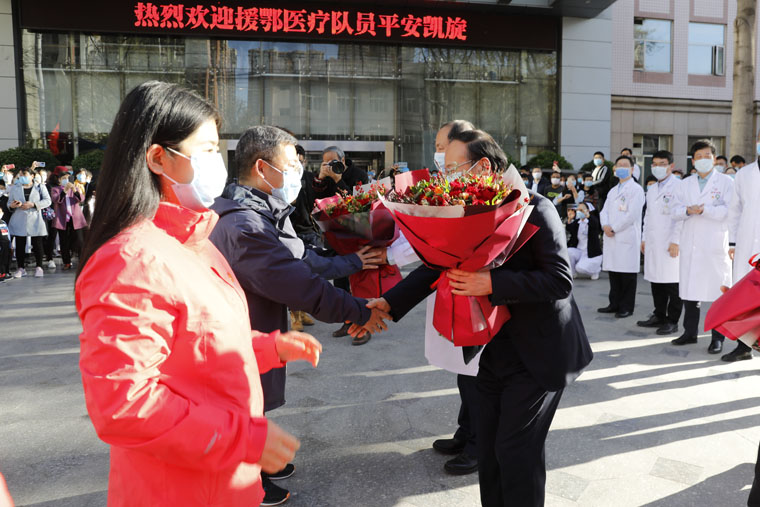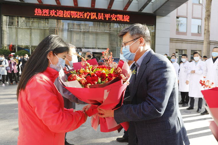 党委书记单保恩,院长徐金升和全体院领导、队员家属以及相关科室人员共同迎接亲人回家。领导、家属和同事为勇士们献上了代表思念和祝福的鲜花。