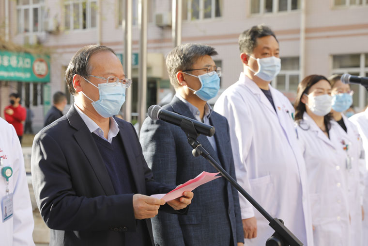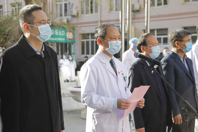 前庭广场却是一派暖意。医院为队员们举行了简捷而热烈的欢迎仪式。河北医科大学党委常委、党委副书记倪铁军,党委常委、副校长闫宝勇等领导到现场为勇士接风。学校党委常委、副校长、果冻传媒