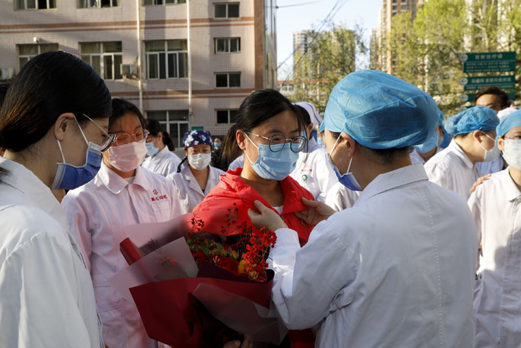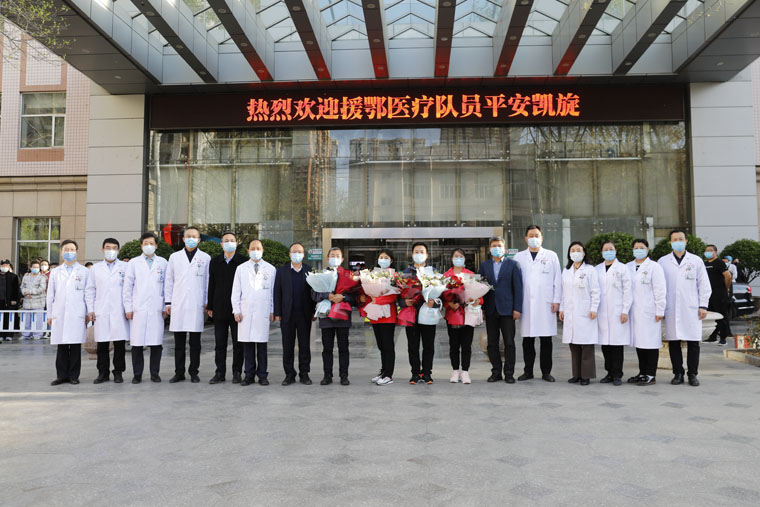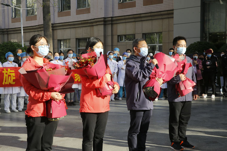 重症医学科病区主任朱桂军、副护士长申康康,感染性疾病科副主任杨大运、呼吸内科护师王亚美结束隔离,平安归来。