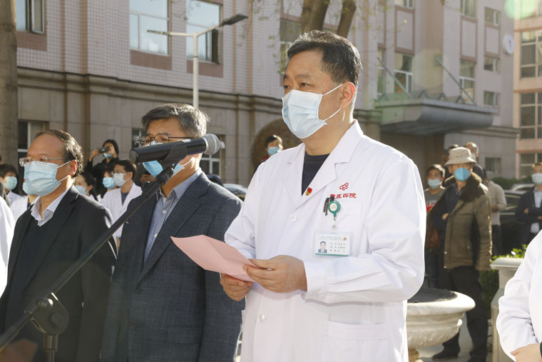 参加河北省第一批支援湖北医疗队的队员发言。他向大家简要介绍了医疗队在武汉前线的工作情况,并表示“武汉55天逆行抗疫,是我们人生的重要经历,也是思想的一次升华和启迪。我们深刻体会到,只有党坚强正确的领导、全国人民的协同作战、医大和四院作为我们的坚强后盾、加上家人的理解、包容和支持,才是我们能取得胜利的坚实保障。今后我们将继续努力,继续发挥专业优势,发挥医大人、四院人能吃苦、能战斗、讲学术、讲团结的精神,为我们四院、医科大学的发现贡献我们的力量。”