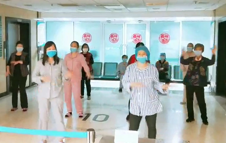 放五科主任周志国与护士长杨帆率先垂范,从年三十开始一直坚守岗位,严格梳理流程,妥善安排工作,给予队员信心和勇气。主管护师支静作为第二批进驻发热门诊的成员,扛起责任,经受考验,在医院一线默默付出。刚参加工作不满一年的护士王路琪作为急诊第一批的“守门人”,在疫情最为严峻的时刻为每一位进院患者及家属检测体温。由于放疗患者住院周期长,放五科深入关切患者的生活和情绪,帮助外出放疗的患者打饭,教给年龄较大的患者用微信跟家里人视频通话,还购置了扑克、跳棋、象棋等供患者及家属休闲娱乐。对于一些严重焦虑的患者,主管医生和护士会单独进行心理疏导,同时开展了疫情期间医务人员和患者的心理调查,关心他们的心理健康状况。能歌善舞的护士李晓杰、李梅还将功能锻炼的动作,编成了舞蹈,分批次地教给患者,在保证安全距离的前提下带着他们一起排练,患者们学成后自发在科室中厅跳起了“广场舞”。有一位患者在出院时,用心地为每一位工作人员准备了明信片,亲笔写下感谢。