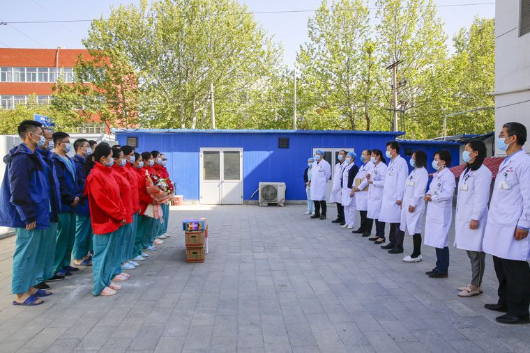 党委副书记李晓玲和副院长耿翠芝、刘运江、东院副院长张爱莉带领相关职能部门负责人代表医院党委分别在本部和东院看望慰问了第四批进驻发热门诊的医护人员,对他们积极主动、顾全大局、勇挑重担的精神表示敬意与感谢。