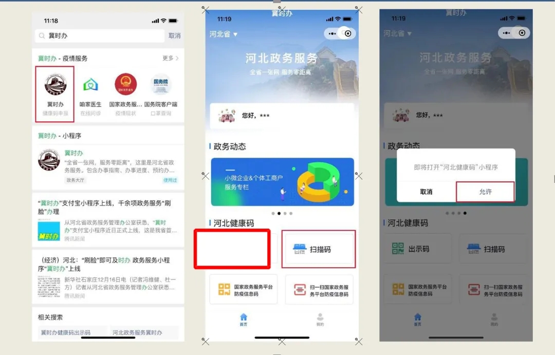 1.微信搜索“冀时办”或用手机扫公示的二维码,打开“冀时办”小程序。