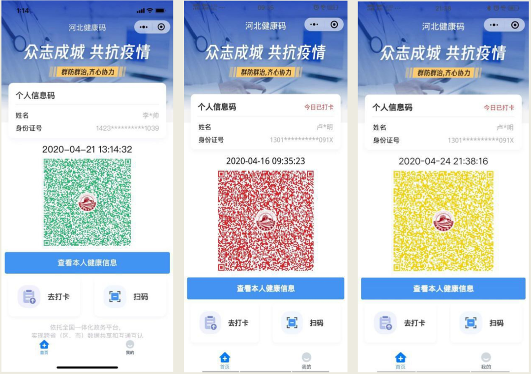 4.出示“健康码”,供“扫码”使用。如果显示“绿码”,可以通行;如果显示“黄码”或“红码”,需核实健康状态。(颜色实例如图)