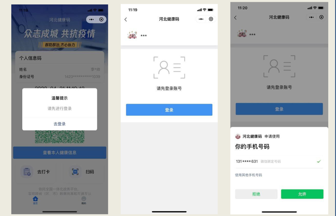 微信搜索“冀时办”→打开“冀时办”小程序→初次使用,需先登录→实名认证→点击“出示码”按钮→初次使用时,进行一次健康申报(去打卡)→亮出本人“健康码”或被动扫码→查看个人健康信息→如果提示“未见异常”可以通行→如果有红色“提示信 息”,要进行健康状态核验。