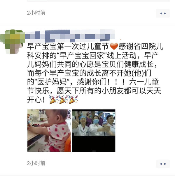 自2017年起,每到六一儿童节,儿科都会邀请曾经在NICU“毕业”的宝宝们“回家”过节,已经持续3年。今年受疫情影响,宝宝们通过“云”回家,体验别样的快乐。儿科新生儿重症监护室(NICU)长期致力于危重新生儿的防治及早产儿的全方位综合管理,在提高早产儿抢救成功率的同时,非常关注他们的远期健康,为孩子们的健康成长不懈奋斗。