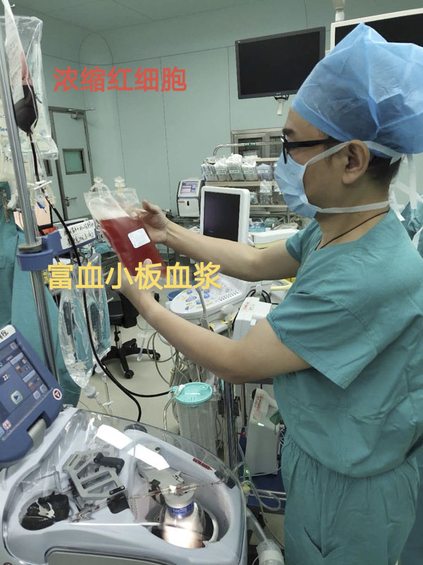 心血管外科,术前诊断为升主动脉瘤,医生决定对其进行全麻体外循环辅助下行升主动脉置换+主动脉半弓置换术。考虑到该手术复杂、历时较长、且在深低温体外循环下进行,患者凝血功能将受到极大影响等,为纠正机体凝血功能,经过认真评估和充分准备,麻醉一科为该患者精准实施术前自体血液分离技术,该技术为术前经中心静脉抽取1100毫升自体血,利用血液回收机将全血分离为富血小板血浆700毫升、浓缩红细胞400毫升,即刻回输浓缩红细胞,留存富血小板血浆,待术毕前回输机体。手术历时9小时,其中深低温体外循环3.5小时,患者术后恢复顺利。