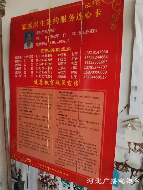 在梁宝芝家的墙上,贴着一张家庭医生签约服务连心卡,上面写着家庭医生的名字---张亚军,还有他的电话、职称。现在基本每个贫困户,还有一些村民家里边,都贴了这样一张卡片。张亚军说,家庭医生是百姓健康的“守门人”,对贫困户要做到签约全覆盖。家庭医生提供的医疗服务是全方位的:每年免费体检一次,每年跟高血压患者见4次面,提供健康指导、用药指导、转诊等服务,有效避免因病致贫、因病返贫现象的发生。