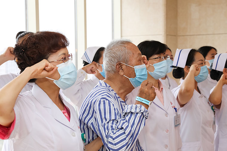 第三党支部举行重温入党誓词活动,其中一位90岁高龄且已有64岁党龄的老年患者也积极参与其中,他激动地说:“我56年入党,跟着党走,工作了几十年,特别希望党和国家越来越好!”