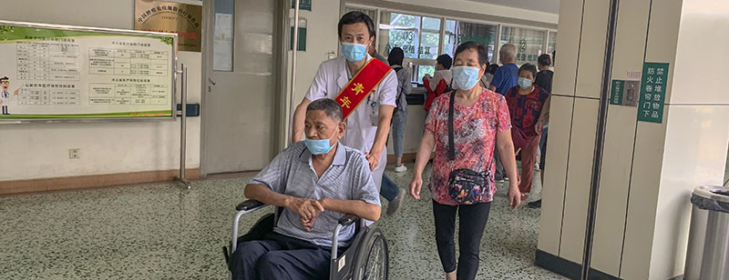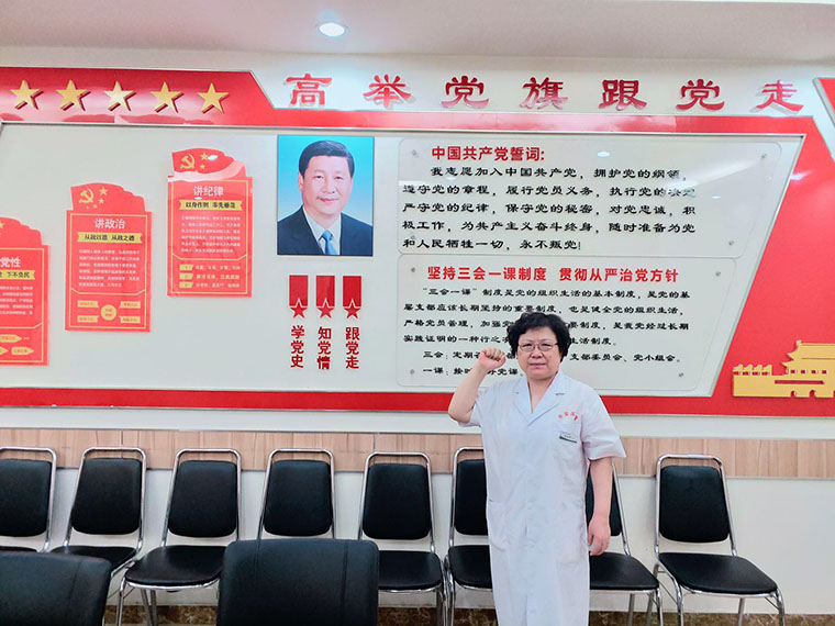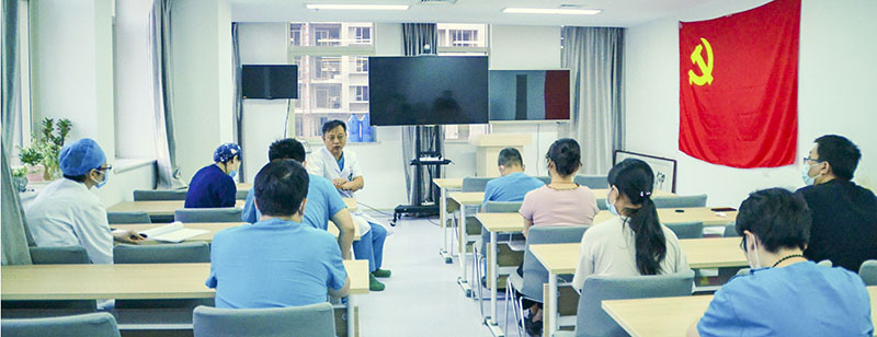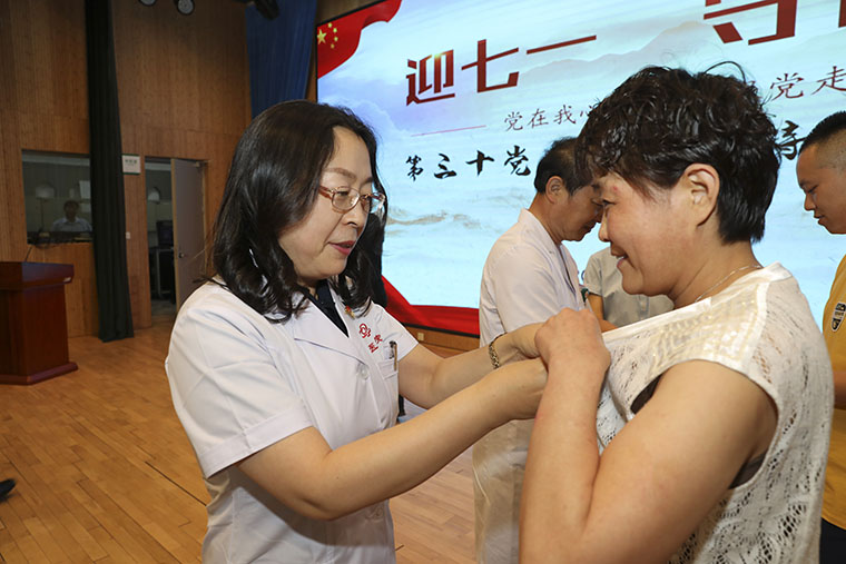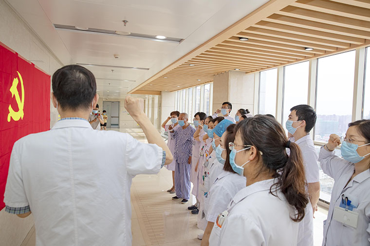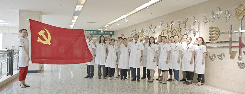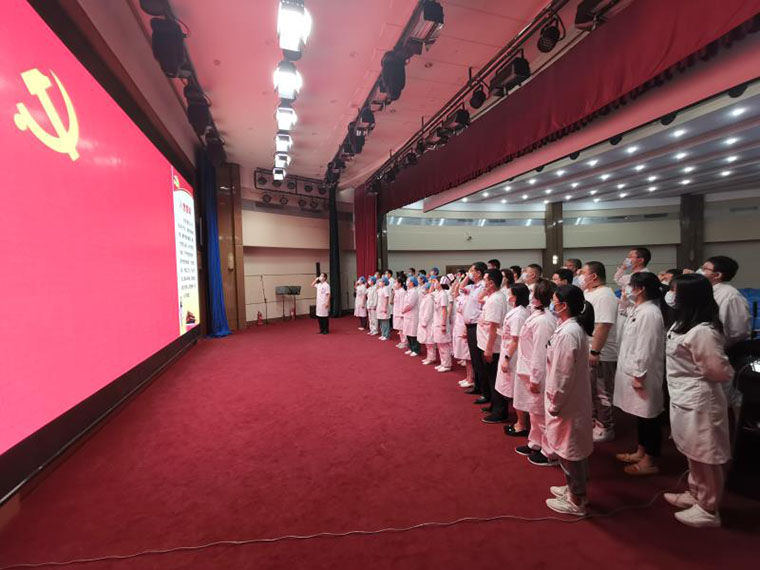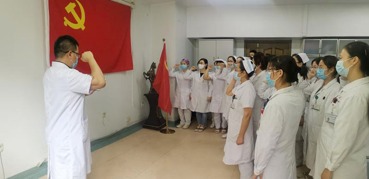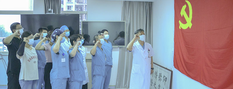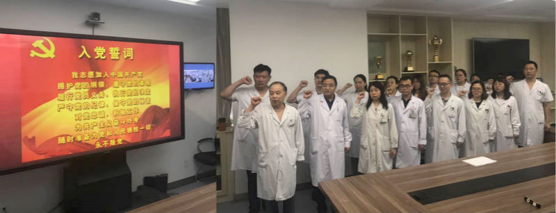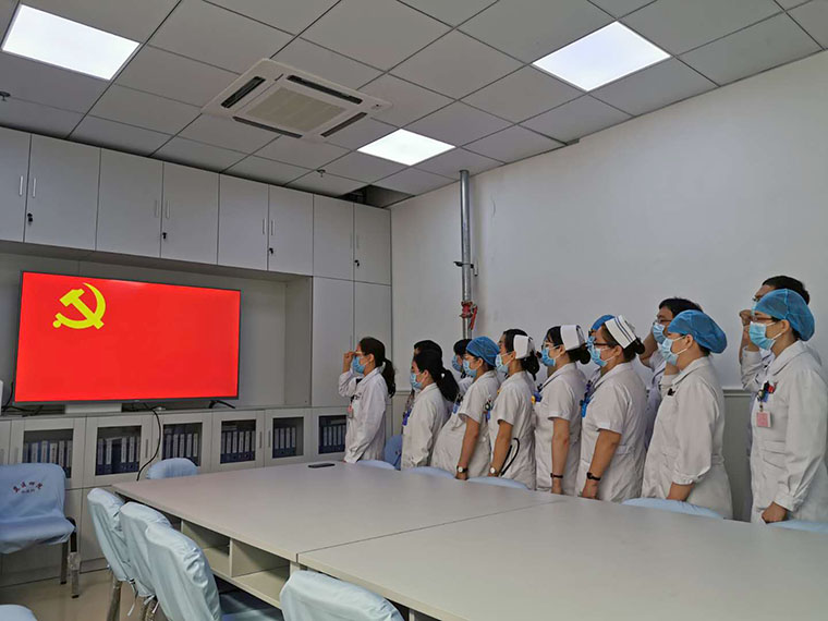 第34党支部全体党员一起高唱国歌,在党旗下宣誓,重温入党誓词并以实际行动庆祝党的生日:为患者及家属进行导诊、导医、就诊流程指导等多种形式的服务活动。