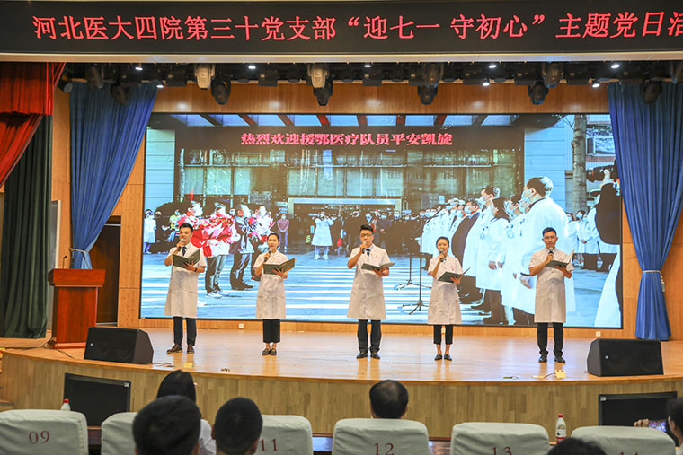 第四党支部全体党员共同观看中国共产党党员入党誓词歌MV,全体党员面对鲜红的党旗庄严宣誓。随后支部同志精心准备了诗朗诵。最后在全体大合唱《没有共产党就没有新中国》《冀医四院院歌》的歌声中主题党日活动圆满结束。