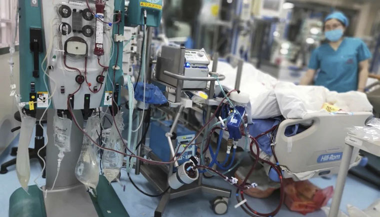 “主任,有一名48岁被大型机械挤压的多发伤男性患者,多发肋骨骨折,双侧液气胸,氧合50%,急需ECMO支持,但我们的ECMO在用,特向您请示。”