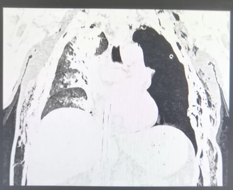 然而,大量的气泡从胸腔闭式引流管喷出,我们意识到,这样下去肯定不行,带ECMO做CT检查,再次请胸外科会诊,讨论手术的必要性。