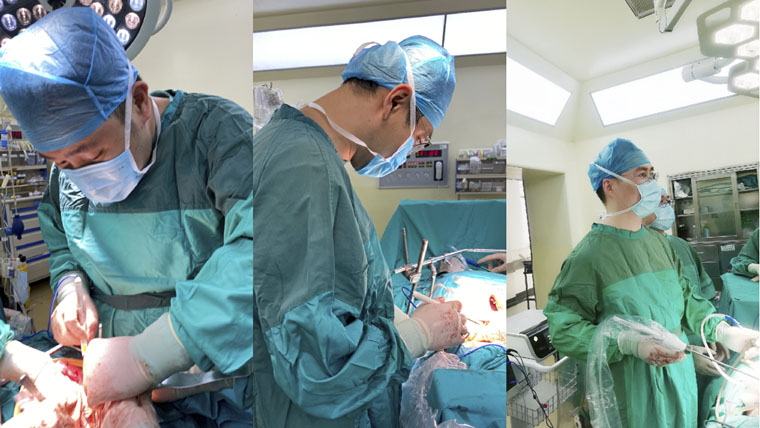 外二科刘亚彬主治医师(左) 、肝胆外科孙超主治医师(中) 、泌尿外科吕县强主治医师(右)进行手术