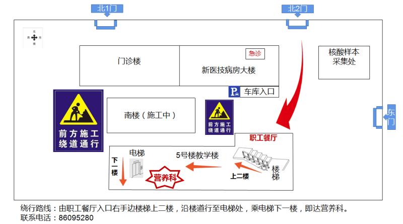 南楼管道连廊施工,教学楼(5号楼)前的主干道临时封闭,如前往营养科,请根据下面示意图绕行,由此给您带来的不便,敬请谅解!
