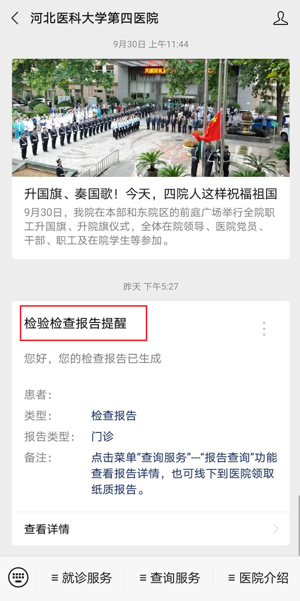 于2020年10月起,正式启用检验和检查报告查询功能,患者可通过微信公众号绑定就诊卡信息进行相关结果查询,进一步优化了患者的就医体验。