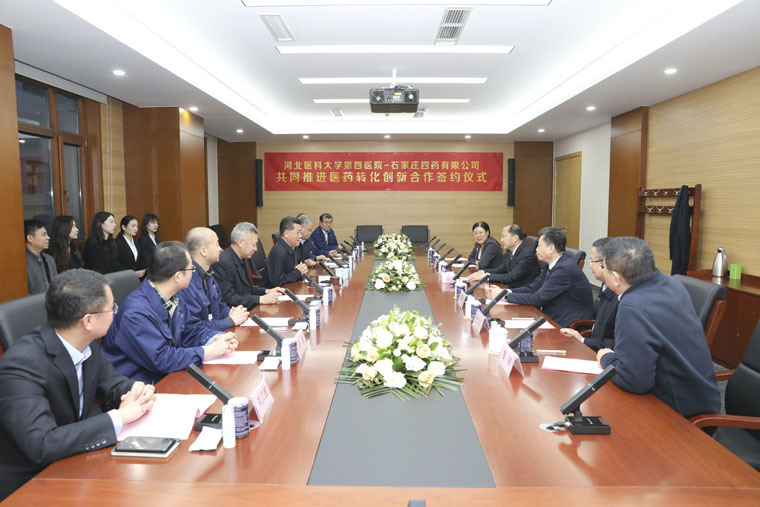 党委书记单保恩、副院长刘运江、科研处处长施靖、药学部主任杜文力、临床药理研究部主任王明霞与石家庄四药集团董事局主席曲继广、董事长苏学军、总裁吴恒耀等出席签约仪式。