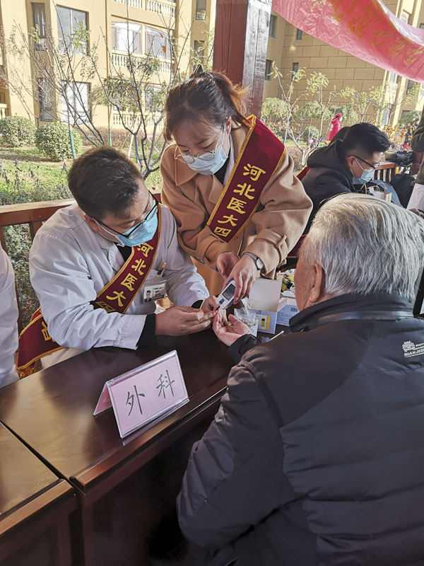 户外活动现场,志愿者们不畏严寒,认真耐心地解答老年人关于高血压、心脑血管病等疾病的预防康复方面的问题;对于身体不适的居民给出就医指导意见,叮嘱老人们关注身体状况,定期体检;为社区居民免费测量血压、血糖,根据测量结果告知健康管理方面的注意事项,重点就“三减三健”(减盐,减油,减糖,健康体重、健康口腔、健康骨骼)保健知识进行了宣传讲解。本次活动共发放健康宣传资料近百份,服务居民群众100余人次。