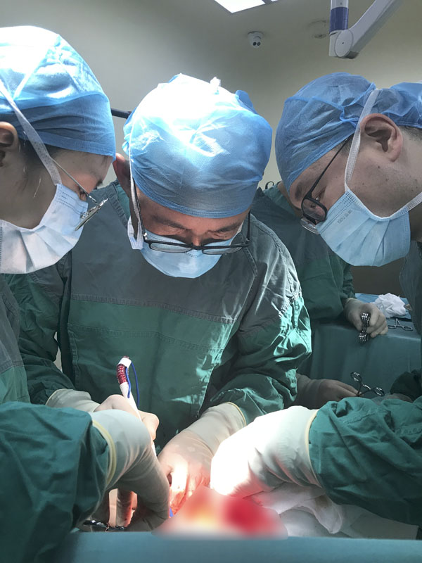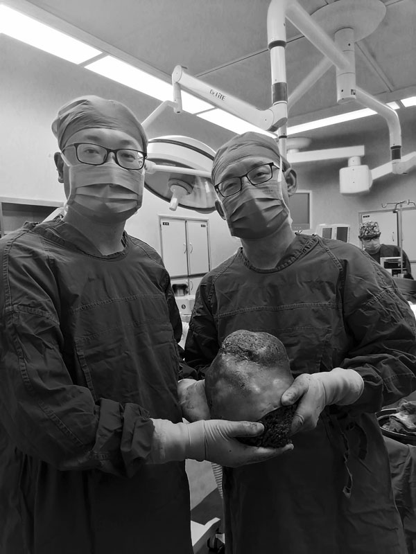 手术当日,由齐义新主任医师主刀、史佳杰主治医师担任一助。患者左乳肿瘤负荷大,皮瓣菲薄,在手术过程中发现肿瘤的血供极其丰富,血管迂曲扩张如蚯蚓状,手术比预想的还要困难,整个过程举步维艰,仅结扎血管就有近70余处。经过近2个小时的耐心分离解剖,他们顺利将左侧乳房完整从胸肌上剥离,且肿瘤完整无损。手术历时3小时,近20斤的肿瘤被完整切除。齐义新主任医师、史佳杰主治医师严密细致地冲洗、止血后放置胸壁引流管并缝合手术切口,术中患者生命体征平稳,出血量约100ml,麻醉清醒后顺利返回病房,术后恢复良好,顺利出院。