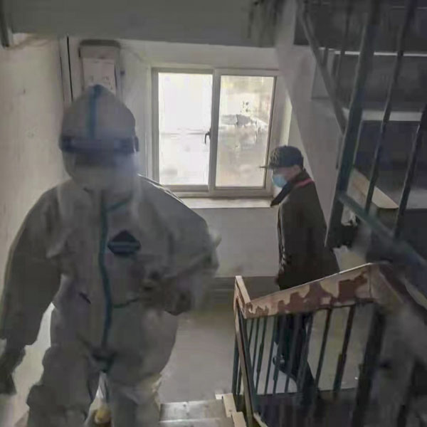 由于采集点所在区域多数为老旧小区,这就需要队员们不断地上下楼梯入户操作。“刚爬完了这个单元的六楼,又要爬另一单元的五楼,我们和志愿者们累地气喘吁吁,满头大汗。但每到一户,居民都非常感激,老人早早地坐在家门口等着,嘴不住地说,你们辛苦了”,一位采集队员事后回忆道。这一日,很多队员光爬楼梯的时间就在2个小时以上,由于屋内外温差较大,每次进屋时面屏和眼镜都看不清,口罩憋得喘不过来气,而下楼的时候,由于身着防护服行动不便,需要扶着楼梯一步一步地走,避免跌倒。当入户任务圆满完成时,几位脱下防护服后的女孩儿靠在椅子上就睡着了。