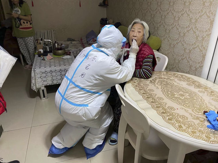 第二批赴社区核酸采集队员在抵达各自目的地后和社区工作人员、志愿者们紧密配合,迅速完成准备工作,居民们有序排队,又一场和时间赛跑的全民总动员拉开帷幕。出示身份证、扫描、拍照、采集……大家默契配合,不到20秒的时间就可以完成一位居民的采集和信息录入工作。首日温度低至零下19度,队员们“全副武装”,戴着单薄的橡胶手套精准完成一次次咽式子操作。由于本次采集速度更快,也就意味着进行“手卫生消毒”的频率更高,寒风略过如同刀割,但大家似乎对这份冰冷刺骨的感觉习以为常,心里想的就是“快点、再快点”。