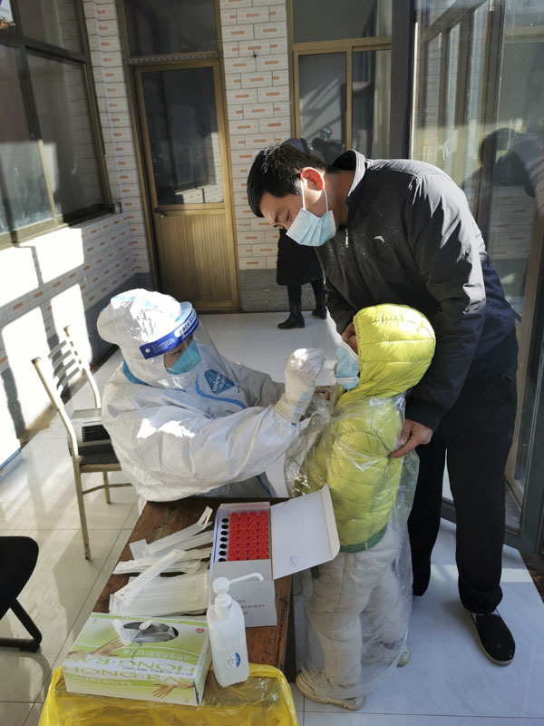 凌晨4:30,我们30人集结于医院,整装待发,奔赴藁城。抵达后迅速组织开展工作,我们被分到四个村子,两人一组负责一个片区,虽然做了充分的准备,但还是遇到了很多困难。我们在零下17度的环境下户外作业,一口气工作10个小时以上,经常是凌晨6点吃早饭,直到下午4、5点才能吃上午饭。如此刺骨的寒冷是我从未体验过的,但是为了不让乡亲们等太久,我们让村干部每次只通知4到5户人家,采集完了再通知其余几户。乡亲们看我们太辛苦,心疼地说:“我们站五分钟都冻得直跺脚,你们一待就是10几个小时,太不容易了。”在南营村,60多岁的老村长给我们收集来许多暖宝宝,懂事的小朋友在采完核酸后,向我们深深地鞠躬、敬队礼,乡亲们看见我们隔离衣上写着省四院的标记,纷纷竖起大拇指点头称赞:“省四院,真是棒!”