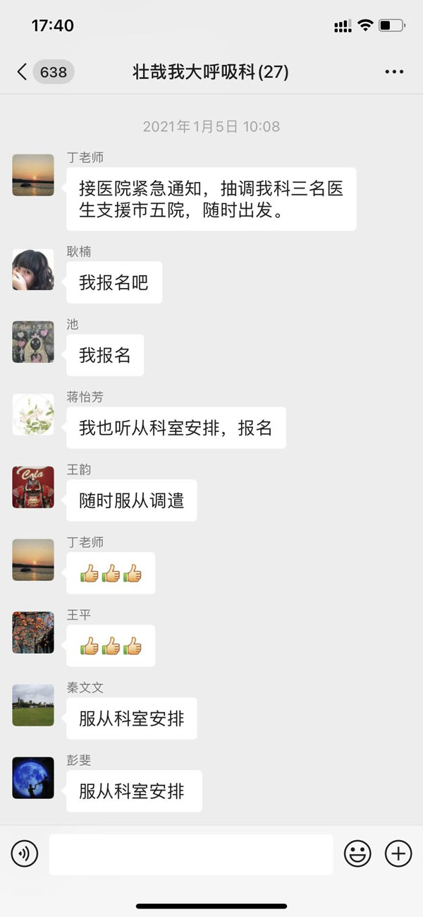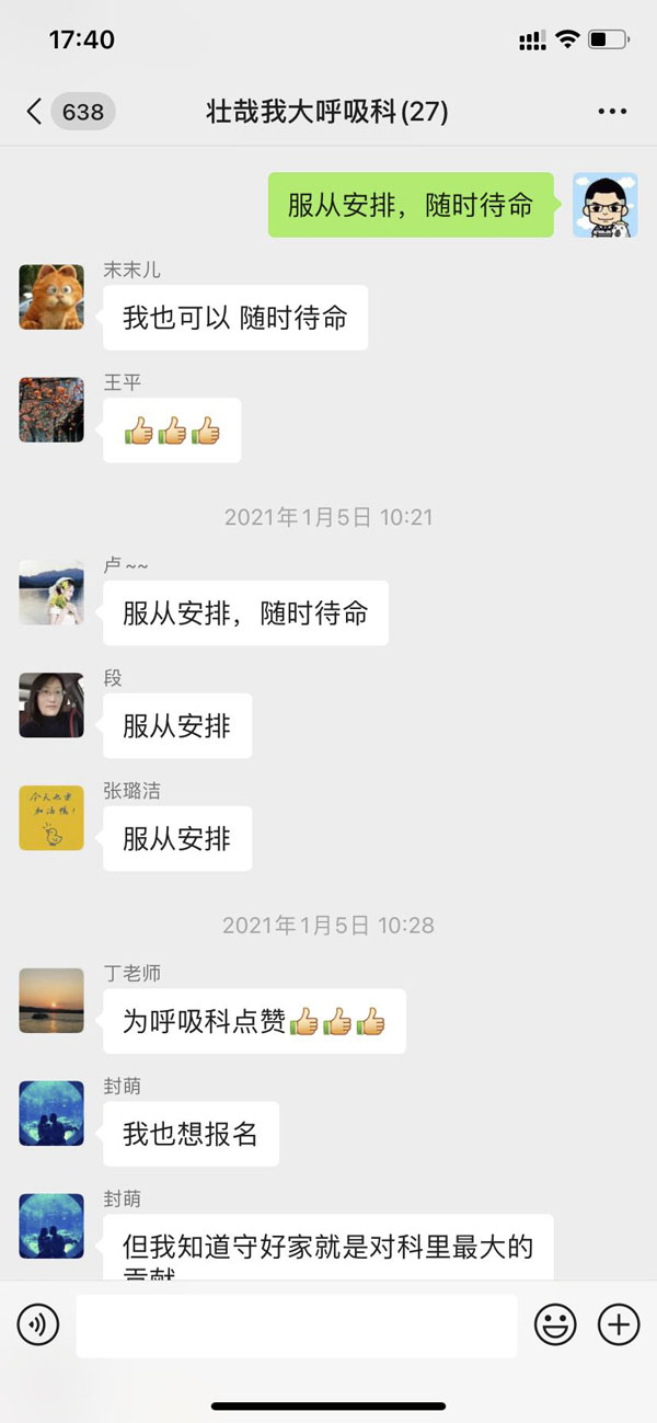 抽调医护人员参与组建抗疫医疗队的任务,短短的几分钟内,科室微信群里请战的信息滚动刷屏。没有华丽的辞藻,没有空洞的口号,一句简单的“我报名”,体现了呼吸内科医护人员面对疫情无所畏惧、勇敢向前的亮剑精神。