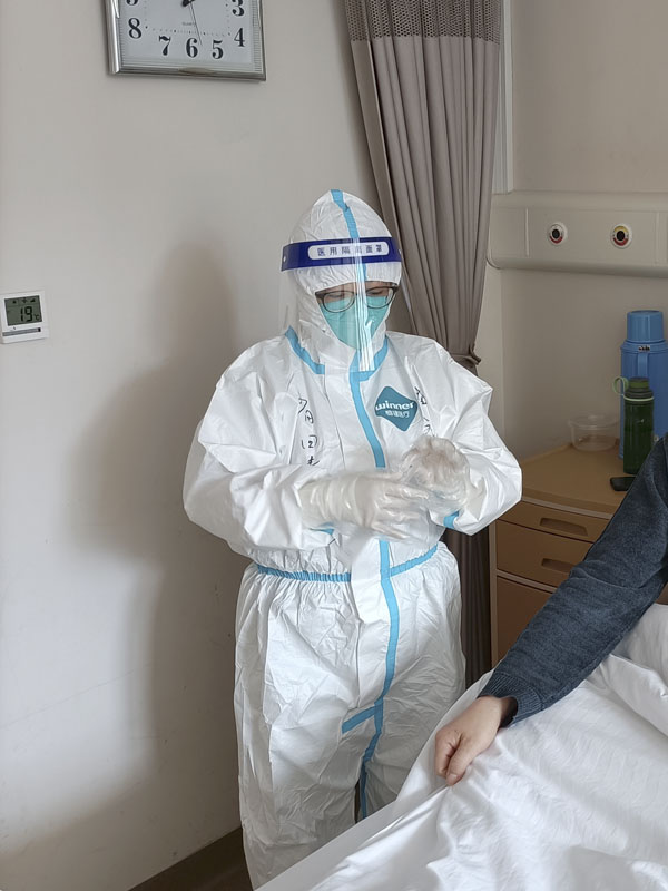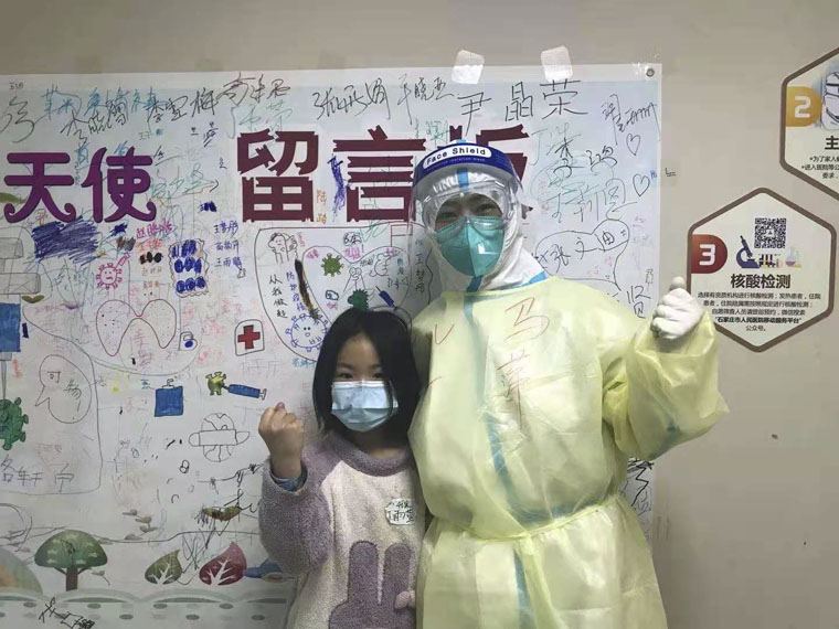 这支医疗队中还有4位儿科的医护人员,尚颖、戴若恒住院医师和马萍、张华主管护师。面对一线工作,尚颖和戴若恒两位年轻医师毫不畏惧、迎难而上,以最快的速度完成感控培训,熟悉工作流程,投入到紧张的日常工作中,时刻关注孩子们的病情和心理变化。新冠儿科病房是没有家陪的,为了照顾孩子们的情绪,病房的墙上贴满了可爱的卡通人物图片,医护人员们也格外的耐心和细心。一张写有“我是战士,我是妈妈”的红色条幅极其醒目。在这里,患儿们离开了妈妈,依然有欢声笑语。马萍和张华两位主管护师每日除了完成自己的治疗工作外,就像妈妈一样照顾着这些孩子们的生活起居,喂奶、喂饭、喂药、哄睡、换尿布、换衣服……每当孩子们拉着她们的手,奶声奶气地说,“阿姨,你就像我妈妈”的时候,心里甜丝丝的感觉可以回味很久。