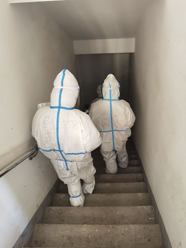 入户采集同样是一件不轻松的事情。队员们为了避免和住户同乘电梯,不管几层都走楼梯。穿着防护服爬楼很不方便,其中的辛酸只有她们自己知道。但大家一句抱怨都没有,依旧认真完成采集任务。脱下防护服的她们,脸上、额头上都是压痕,耳朵后面如同刀割一样地疼。队员们的辛苦付出也让她们赢得了一批“小粉丝”。一位小姑娘把亲手画的绘画作品送给了队员;还有几位小朋友带着糖果、折纸等小礼物送给队员们表达谢意。