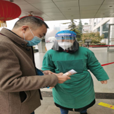 大年初三,临床药理研究部孙婷坚守在东院区预检分诊处为患者服务。