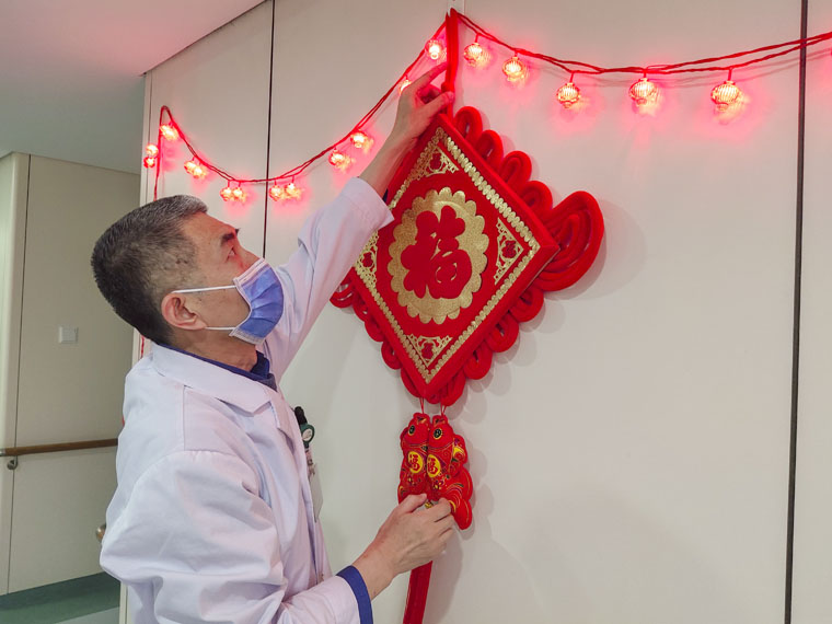 除夕当日,胸六科姚继方在科室挂,把科室精心装扮