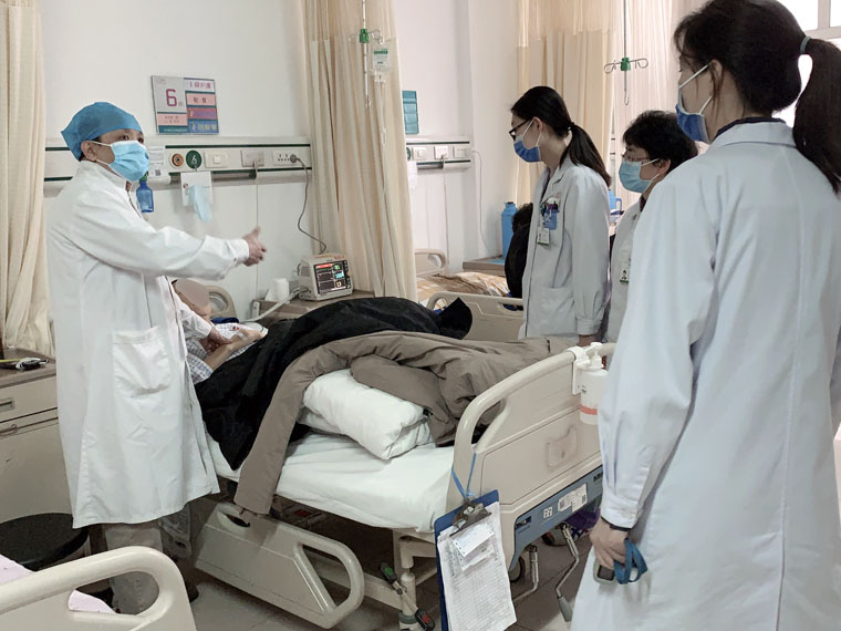 大年初二,姜达带领科室医师对危重病人进行查房。