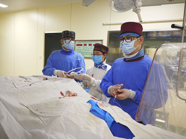 。入院后,内分泌科王富军主任针对病患的特殊性,迅速召集科室医生进行病例讨论,经分析得出,患者创面迁延不愈的原因在于下肢局部的血流供给障碍,若局部血运障碍不解除,治疗只会事倍功半,而首选方案为施行下肢动脉介入手术。该项手术难度较大,手术中的应激、制动时间过长,都会加重患者的心脏负担,而术中造影剂的应用又会不可避免地增加患者的肾脏负担,这就要求手术的“精准化”,在保证手术质量的前提下,尽可能的缩短时间,减少造影剂的用量。在充分告知患者相关手术事宜和风险之后,患者表达了强烈的治疗愿望,“我们这就是奔着你们来的,一进咱们医院就觉得看到了希望。”患者的信任让医护人员倍感振奋,他们积极开展相关准备工作,并与患者进行了详细的沟通。