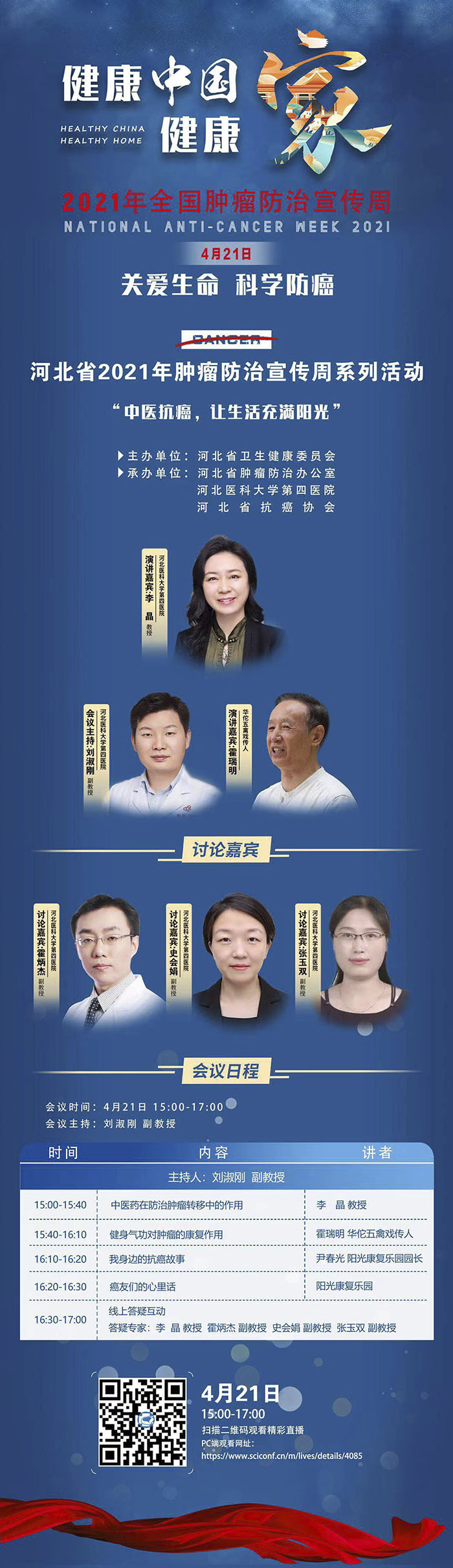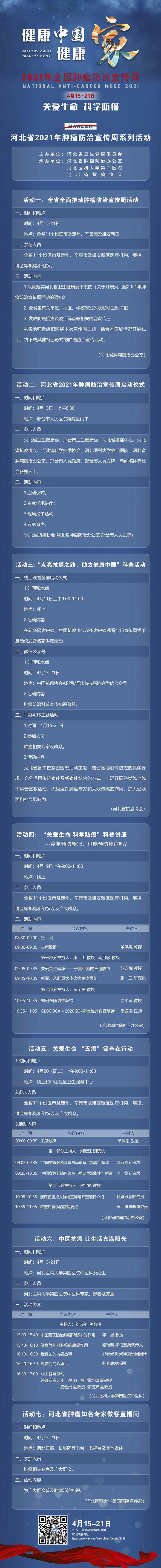 4月15-21日是我国第27个全国肿瘤防治宣传周,今年宣传周主题是“健康中国健康家——关爱生命 科学防癌”。为贯彻落实国家卫生健康委文件要求,进一步推进《健康河北行动癌症实施方案》,由河北省卫生健康委员会主办,果冻传媒 、河北省肿瘤防治办公室承办的“河北省2021年肿瘤防治宣传周系列活动”即将启动。